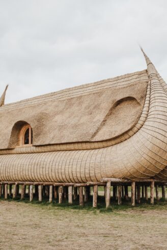 Sivbådebyggeri og stråtækning benytter det samme råmateriale: siv som bundtes for at opnå større styrke og holdbarhed. De tusind år gamle, geografisk adskilte, men beslægtede håndværksteknikker – sivbådebygning og tagtækning – er her smeltet sammen til ét stringent og komplekst, nutidigt værk.